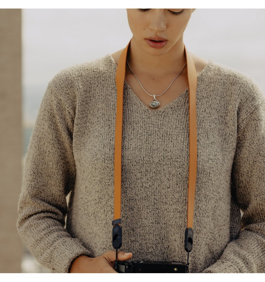 The connectors are a slimmed-down version of the same iconic connection system you'll find on all Peak Design straps, offering secure and effortless camera attachment. A sleek aluminum accessory loop lets you attach a spare Anchor, letting you stow your strap on your body when you remove your camera. On the underside, a custom sealed finish enables the leather to glide smoothly across your body, yet maintains enough grip to not slip off your shoulder.